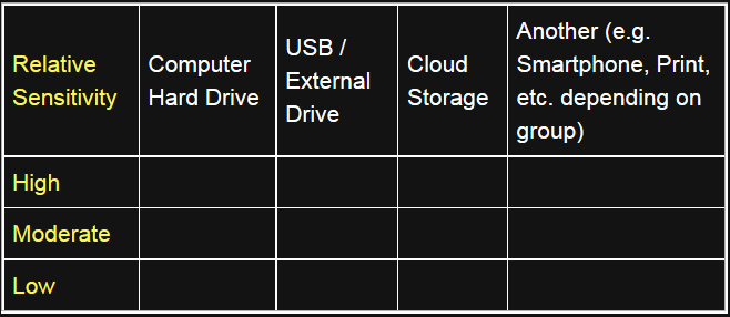 To encourage participant interaction, write one of the above examples on a post-it note and affix it to the appropriate box within the matrix; then, ask whether there is another copy of this data in another storage medium or location. If there is, you can use another sticky (preferably of a different color) and affix it within the appropriate box for where the duplicate is kept. You can use this moment to teach the difference between master copies and duplicates.